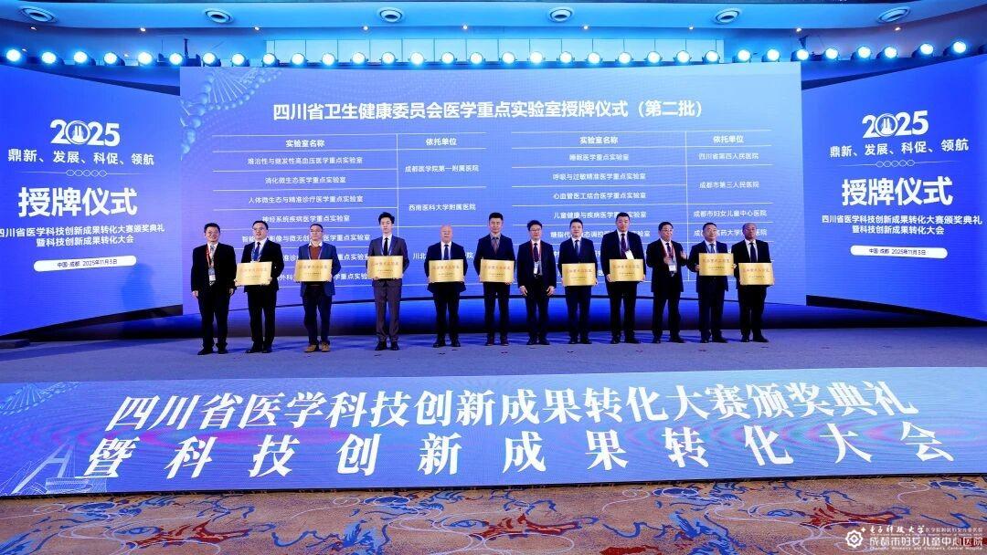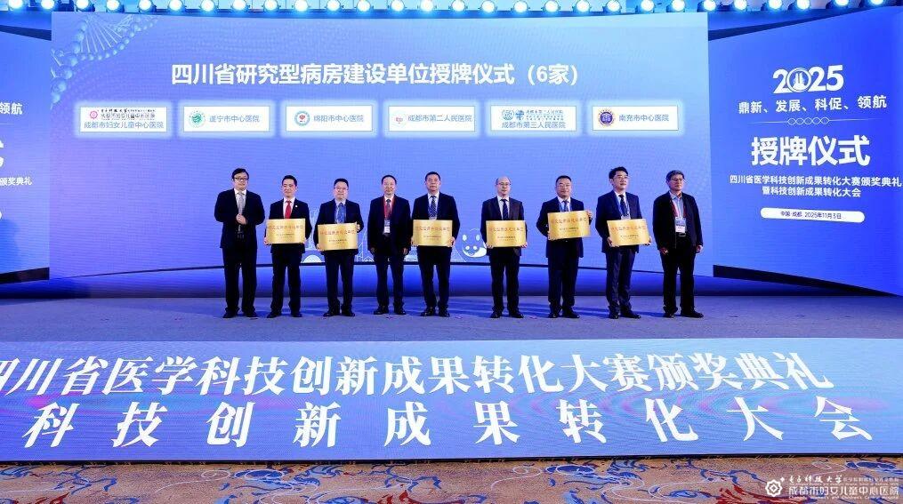 11月3日,在四川省卫健委举办的四川省医学科技创新成果转化大赛颁奖典礼暨科技创新成果转化大会上,成都市妇女儿童中心医院获批“四川省卫生健康委员会儿童健康与疾病医学重点实验室”及“研究型病房建设单位”。院长张利兵、副院长喻琳麟分别代表医院接受现场授牌。