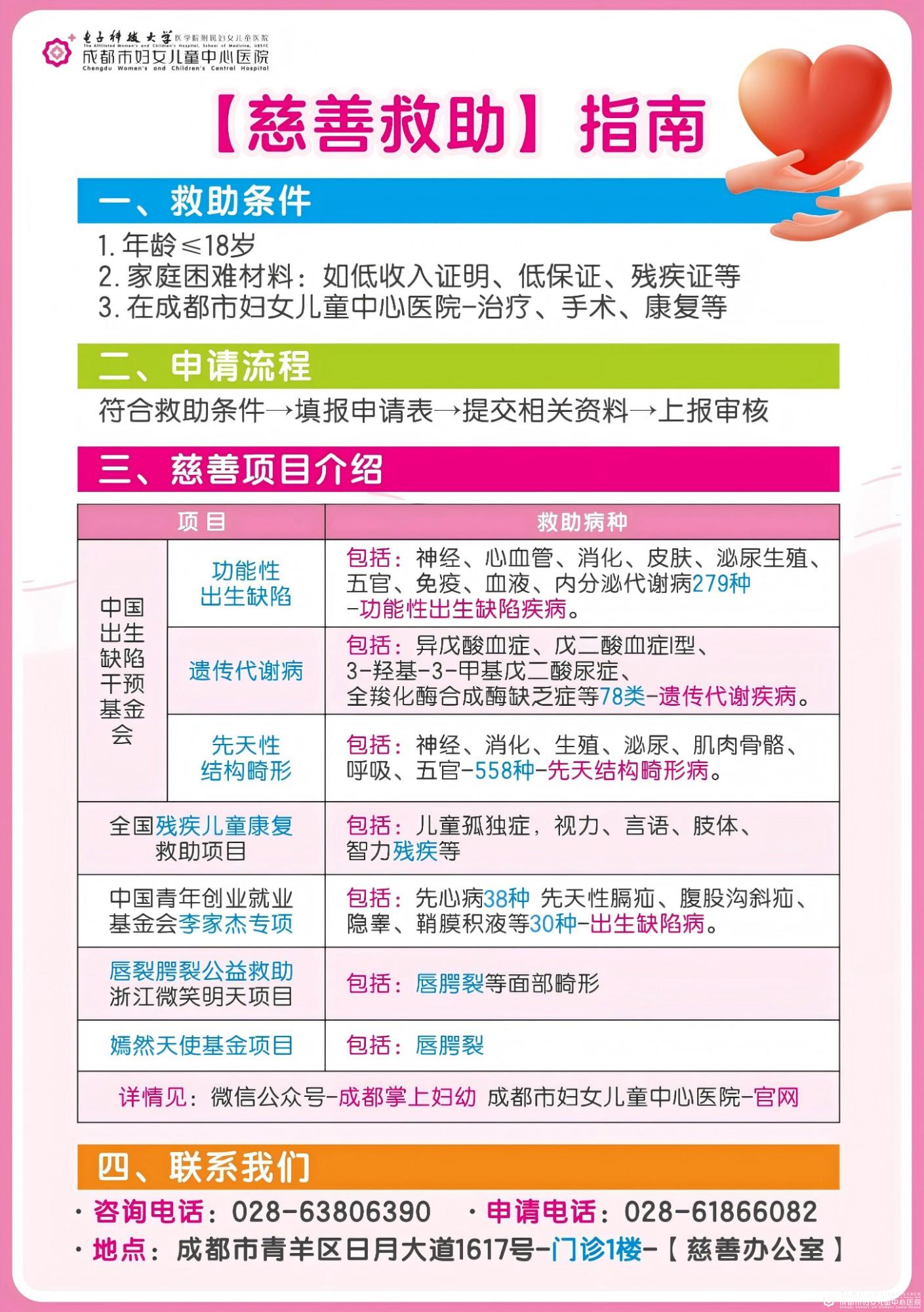 地点:慈善项目管理办公室(成都市青羊区日月大道1617号 门诊1楼 西药房斜对面)